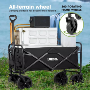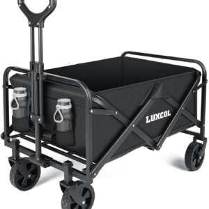 - 【Easy storage and space saving】 When camping, it is often difficult to carry equipment. In this case, a folding wagon can solve the problem. The wagon folds up to only 5 inches thick! Folding measures approximately 17 “x 5” x 24 “. There’s also a handy handle that you can put effortlessly in the trunk or behind the seat. Meanwhile, the portable wagon weighs only 15.4 pounds. It’s very lightweight, so you won’t feel burdened if you want to carry it around