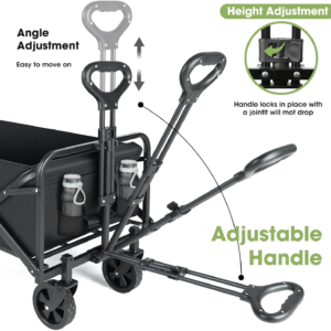 - 【Save time and labour】With two 360° rotating front wheels and adjustable pull rods, you can effortlessly control the direction of the wagon, saving both time and labor. The all terrain wagon wheels are made of superior PVC with strong abrasion resistance, silent shock absorber, no drag marks and enhance the impact resistance of the whole caster. The handle of the camping beach cart can be easily adjusted to fit the height of the person pushing the cart