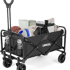 - 【Easy storage and space saving】 When camping, it is often difficult to carry equipment. In this case, a folding wagon can solve the problem. The wagon folds up to only 5 inches thick! Folding measures approximately 17 “x 5” x 24 “. There’s also a handy handle that you can put effortlessly in the trunk or behind the seat. Meanwhile, the portable wagon weighs only 15.4 pounds. It’s very lightweight, so you won’t feel burdened if you want to carry it around